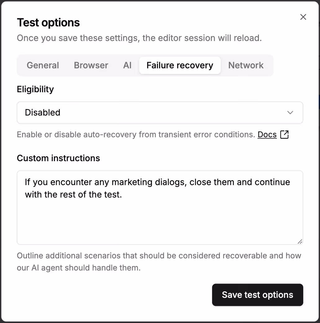 On Thursday, we launched Failure recovery, a novel way to handle test failures. With a flip of the switch, Momentic tests can now automatically recover from transient UI and network issues.