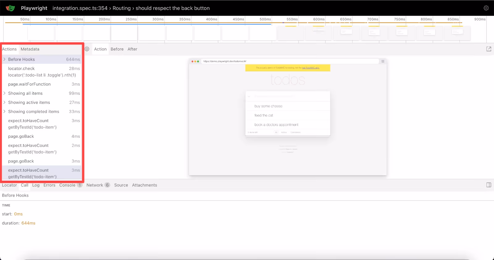 The left sidebar reveals the complete story of your test. In our TODO app example, "Before Hooks" dominates at 644ms - nearly two-thirds of the total test time.